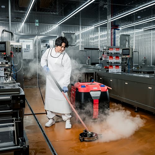 스팀세척기는 화학약품을 사용하지 않고 소량의 물만 사용하여 고온 고압의 강력한 스팀으로 오염물 제거와 동시에 살균을 수행할 수 있어, HACCP 위생 기준을 충족할 수 있는 최적의 장비로 사용되고 있습니다